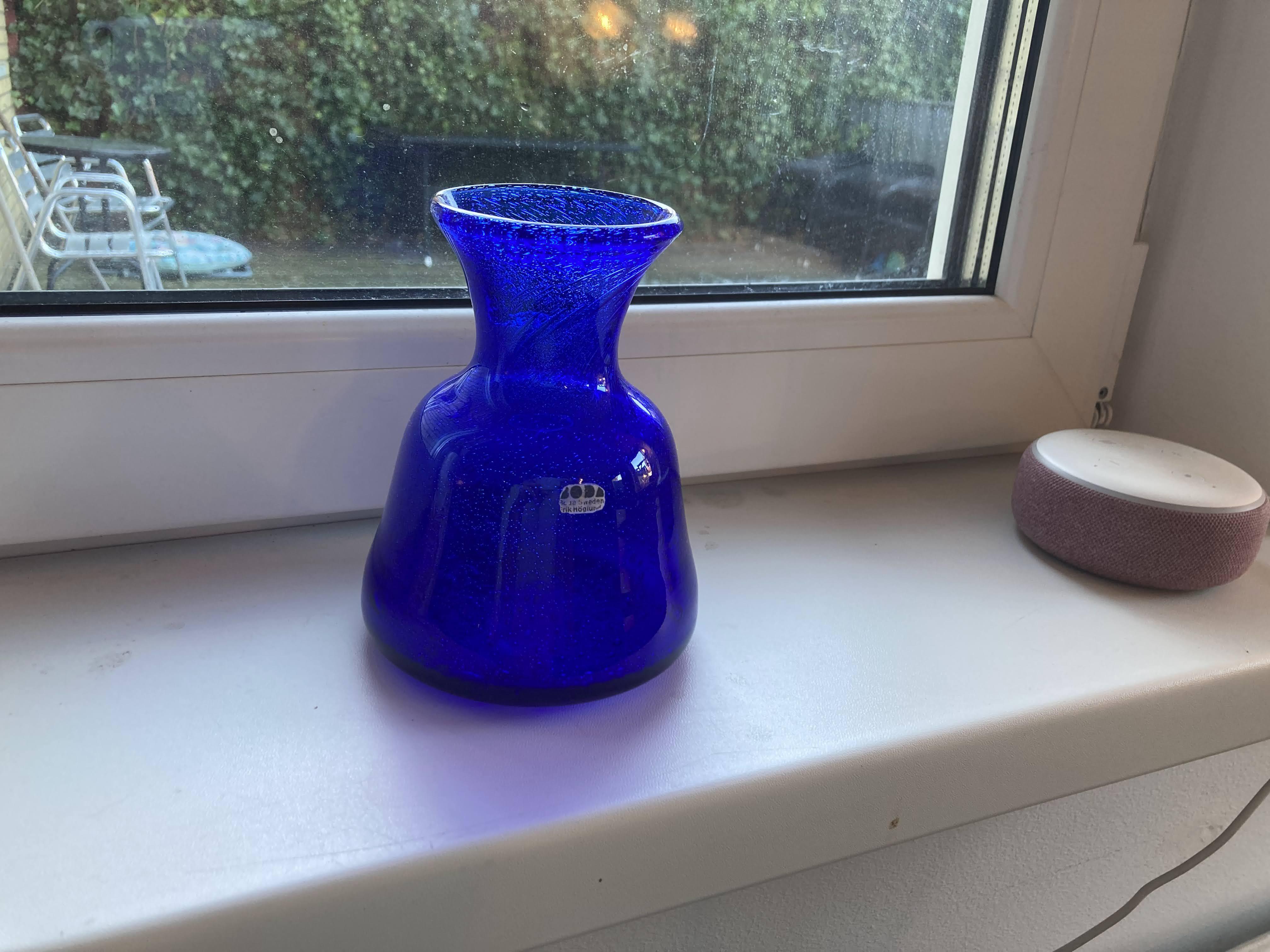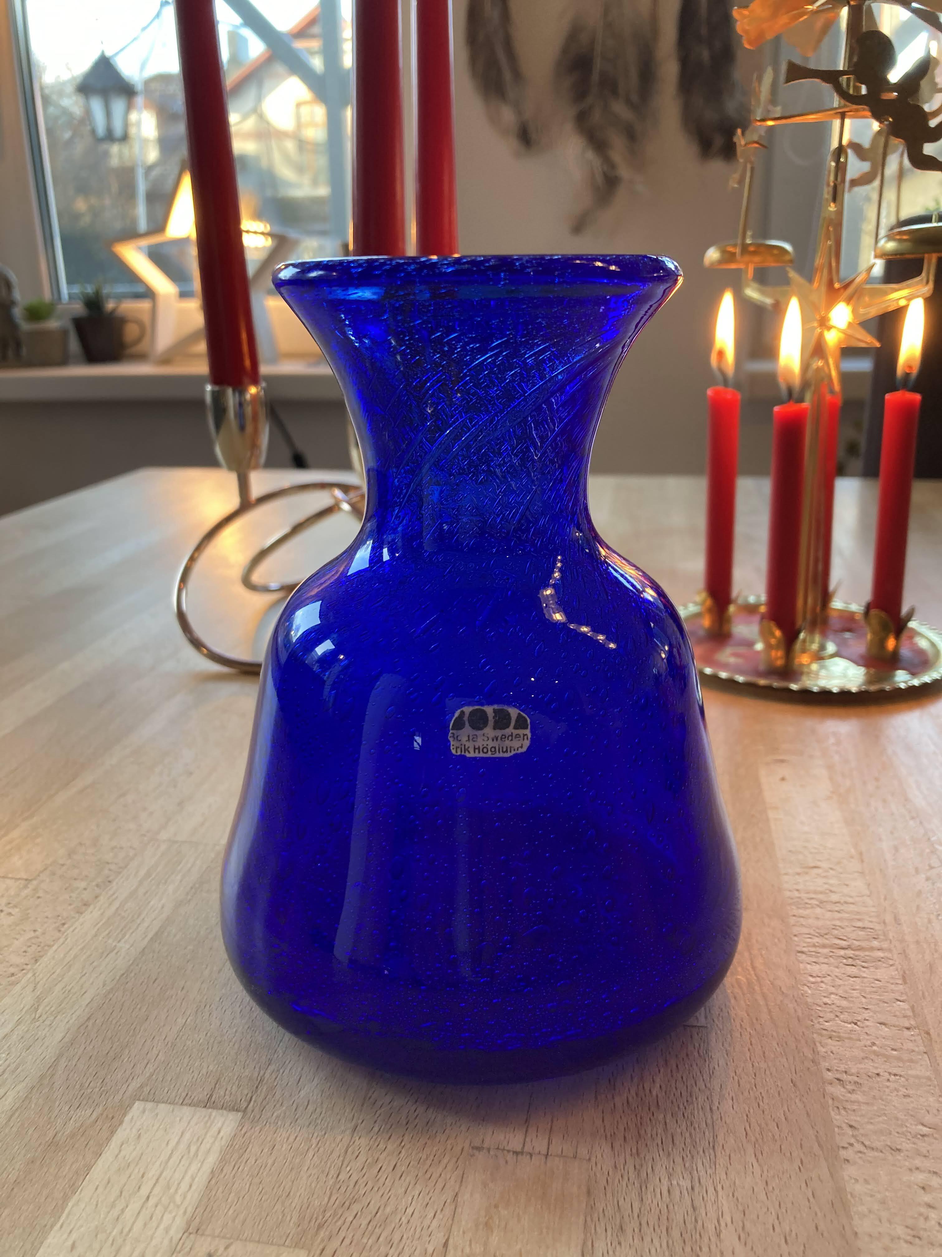 きれいな青色がスウェーデンの夏に合います。花瓶の首のところで、ガラス中に意図的に入れられた泡がらせん状に流れているのが面白いです。