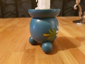 このキャンドルスタンドは、木製1本立てで、青色で表面に白い花の柄が描かれています。大きさは、高さ8cm、幅7cmです。キャンドルを立てる部分には金属製の金具がはめ込まれています。
